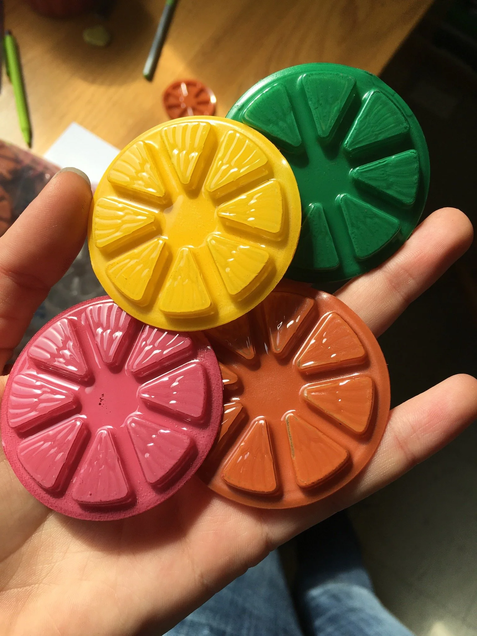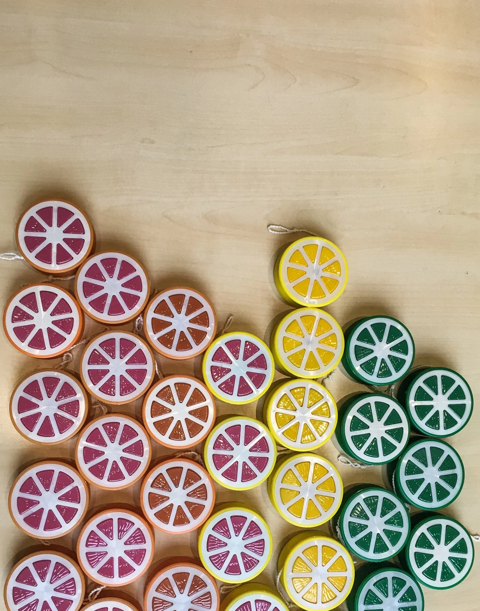 I participated in making every part of these yoyos. My favorite design choices were to make the pulp from clear thermoformed plastic. After I spraypainted them with the paint being inside the yoyo. I love how these citruses came out.